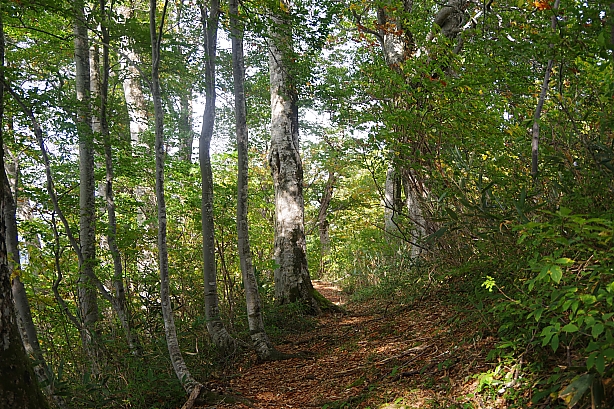 ▲北又登山口を出発。まだまだ紅葉には早いブナ林の尾根を登ります。