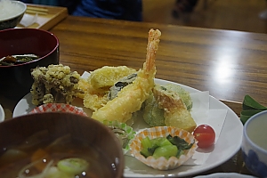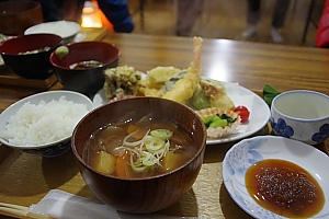 ▲そして美味しい夕食。豚汁に天ぷら、山小屋とは思えない豪華なメニュー。
