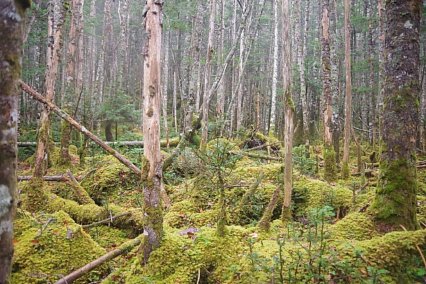 ▲北八ヶ岳特有の苔むす森、中木場を経て茶臼山へ