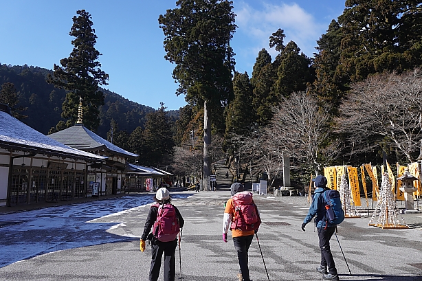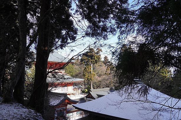 ▲ほんの一部、薄っすらと積雪。寺院の屋根は良い感じで白く成ってます。延暦寺会館到着。
