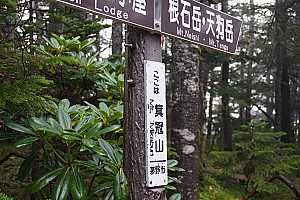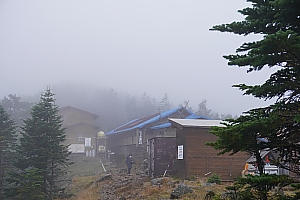 ▲本沢温泉から1時間程、夏沢峠です。硫黄岳がど〜んと見えるのですが、残念ながら深いガスの中。