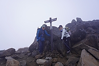▲箕冠山〜根石岳間は年中、強風地帯。今日も突風までは無いのですが…ガスと強風に耐え、根石岳(2603m)