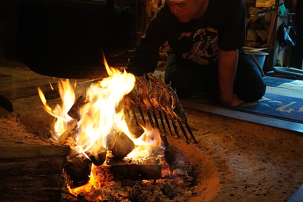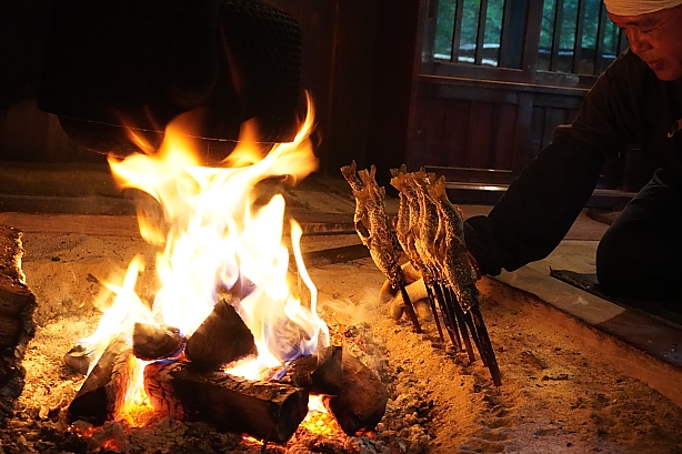 良いですね。嘉門次さんが建てた小屋そのままの、いろりでじっくり焼くイワナの塩焼き。