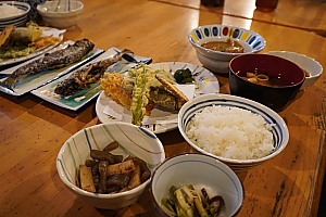 ▲待ちに待った夕食。いろりでじっくり焼かれた岩魚、頭から尻尾まで全て食べられます。