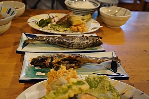 ▲▼待ち遠しい、夕食時の岩魚の塩焼き。