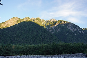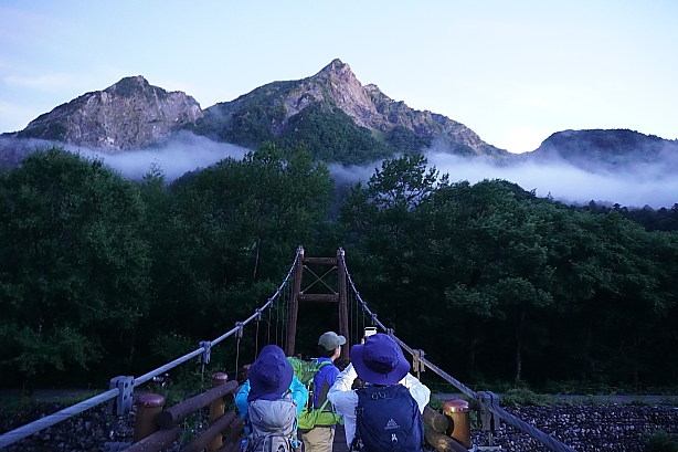 ▲夜明け前に嘉門次小屋を出発。明神橋から望む明神岳です。