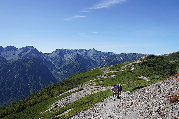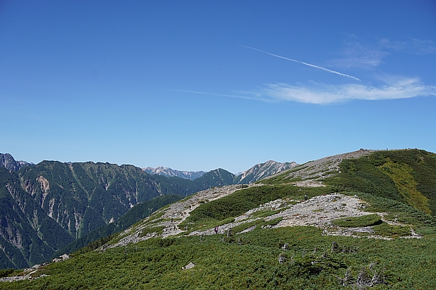 ▲この気持ちいい稜線を蝶槍まで散策します。最奥には野口五郎岳も見えます。