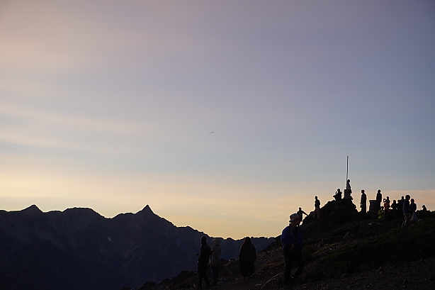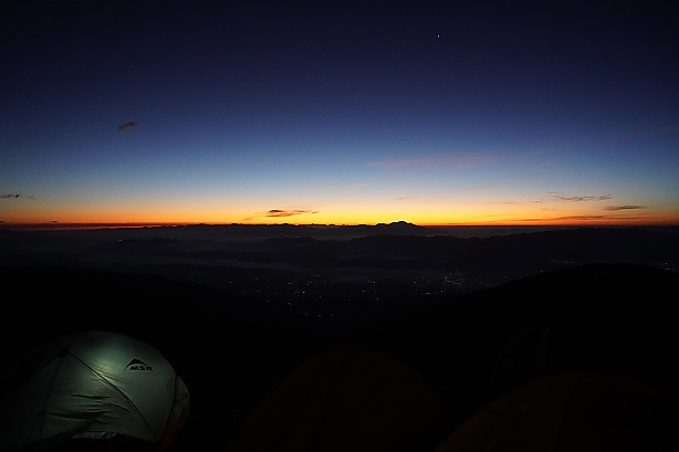 ▼日の出前に蝶ヶ岳ヒュッテを出発。遠くに見える山、浅間山です。(テント場より)