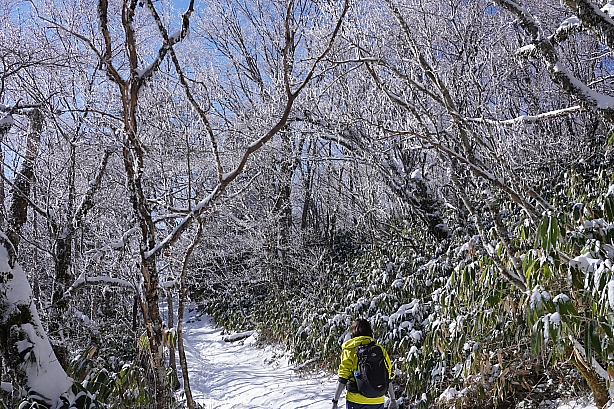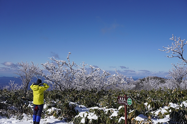 ▲頂上直ぐ手前ではこの景色のお出迎え♪ 青空に霧氷、最高です。