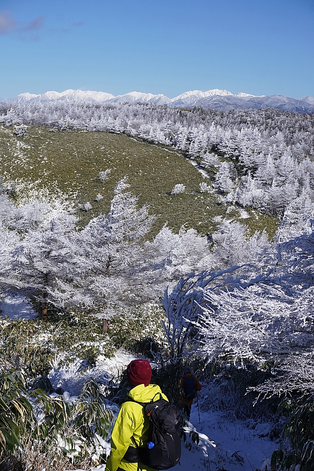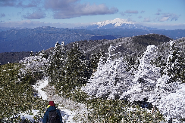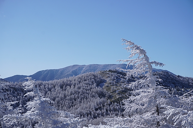 中腹当たりの霧氷は陽ざし強く早や落ちてましたが、南沢山以降はたっぷり楽しめました。