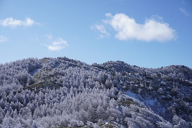 さほど寒くない、風も微風の最高の条件。雪が少ない南沢山でしたが美しい冬衣装、霧氷のお出迎え♪