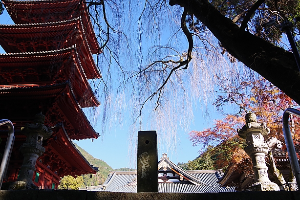 ▲200段を登り着いた所、春に美しい枝垂れ桜と五重塔が迎えてくれます。