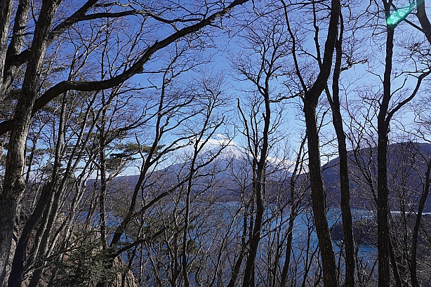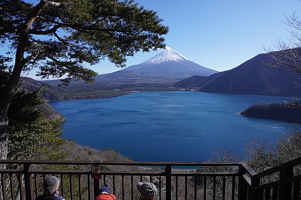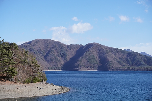 ▲本栖湖畔に降りてきました。見える山が昨日歩いて頂いた、パノラマ台と烏帽子岳です。