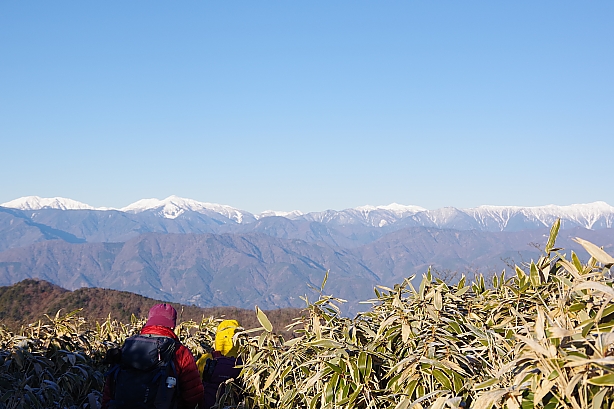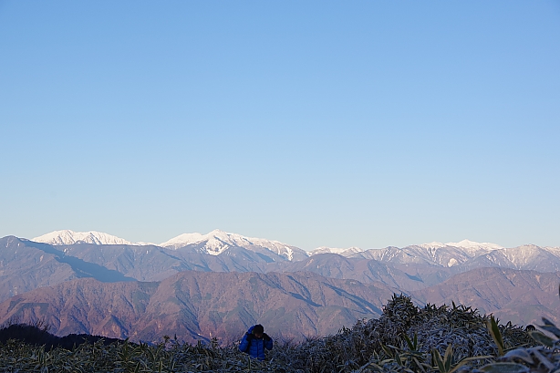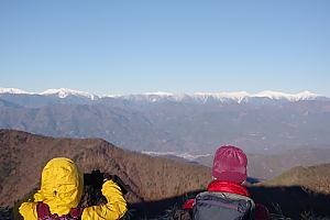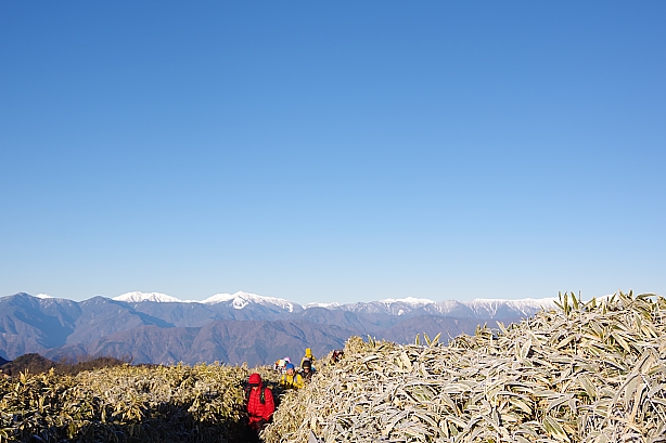 ▲▼竜ヶ岳(1485m)でのお出迎えは白銀の南アルプス。北岳から聖岳までずらっと勢揃い。