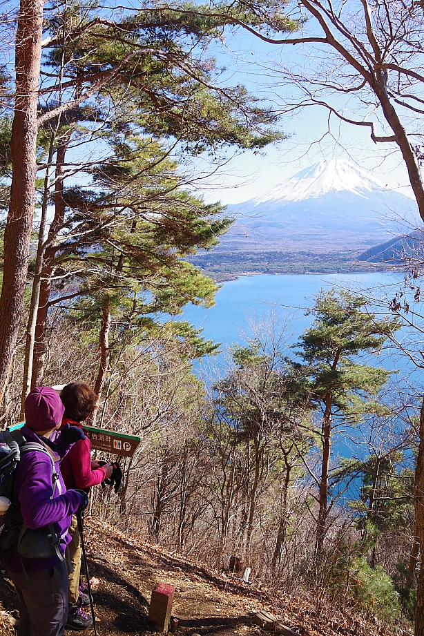 ▲端足峠から樹間に本栖湖を眺めながら湖畔に降ります。