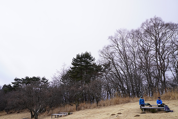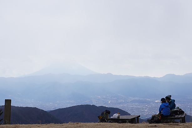 ▲先程の広い所に戻ってランチタイム。寒くは無いものの曇天の空、富士山はぼんやりです。