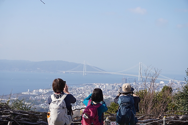 ▲旗振山からは明石海峡大橋がど〜んと。奥が淡路島です。カメラ向けちゃいますよね♪