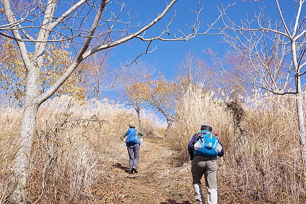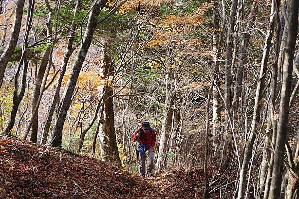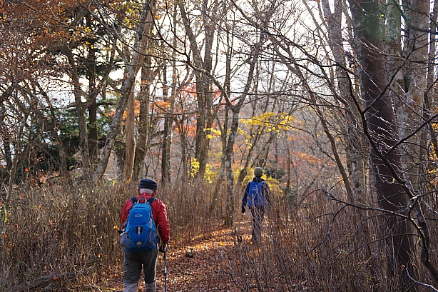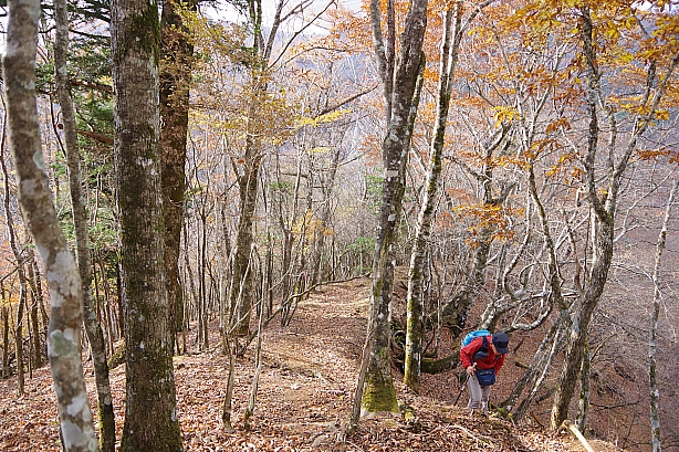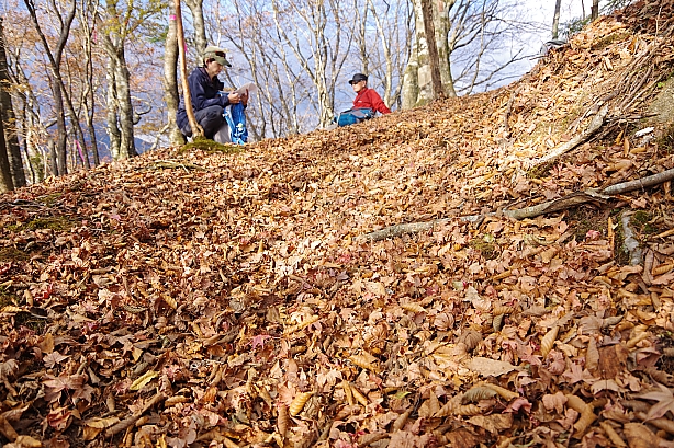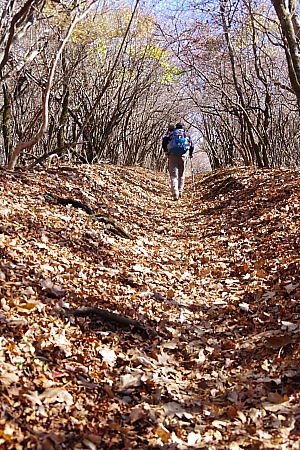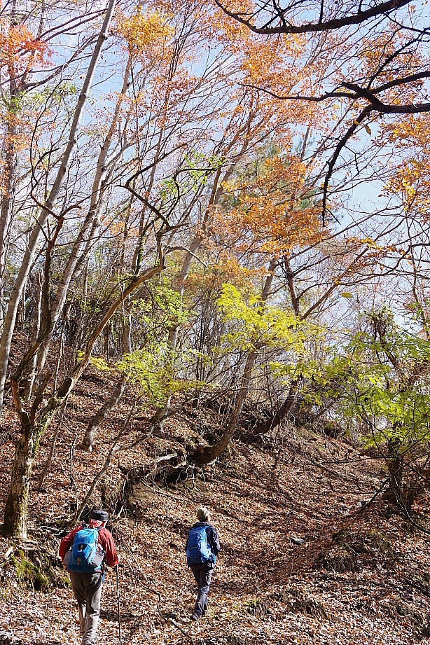稜線上の木々は早や葉を落とし、登山道は落葉の絨毯。積もりすぎて歩き辛い所も有りましたが、概ね気持ちいい