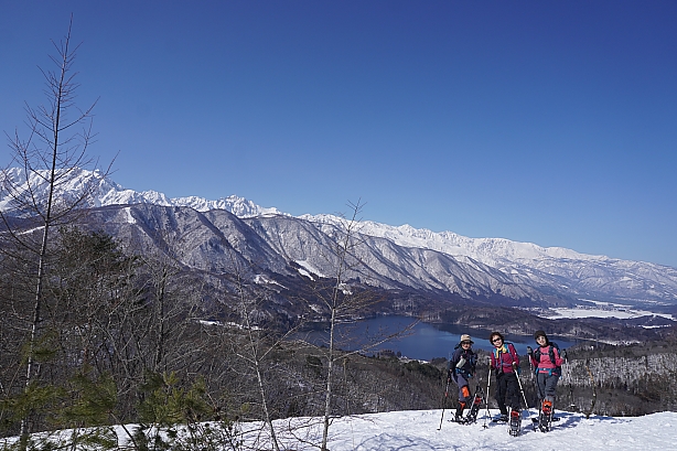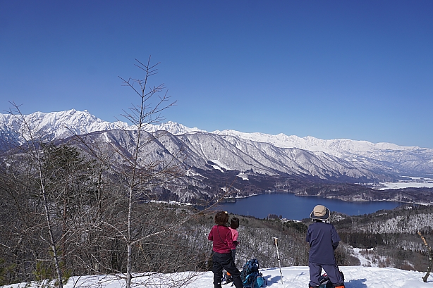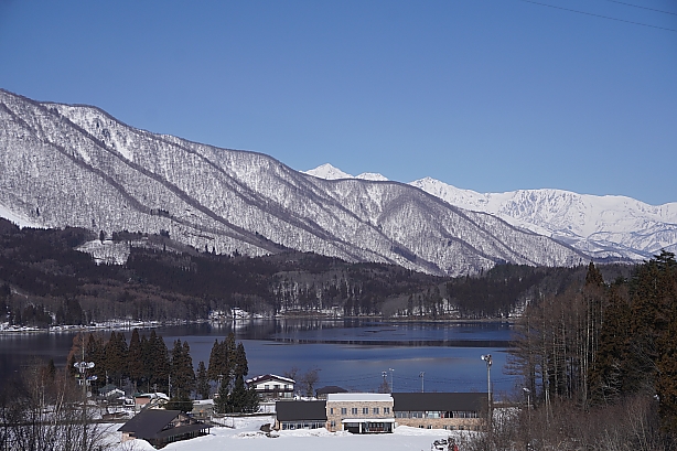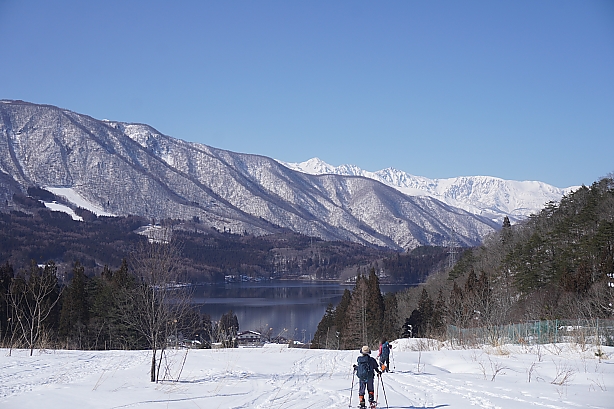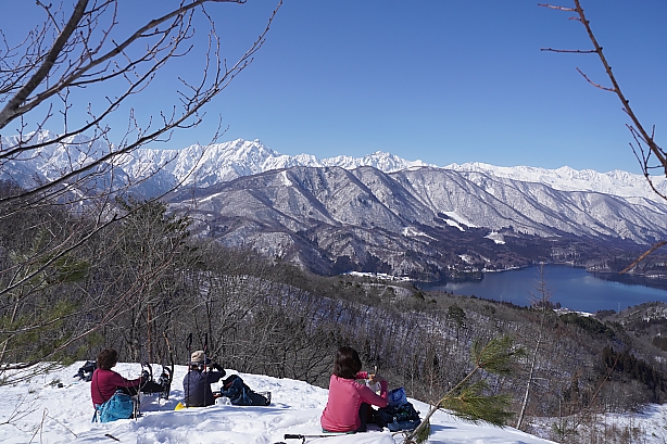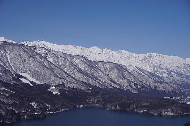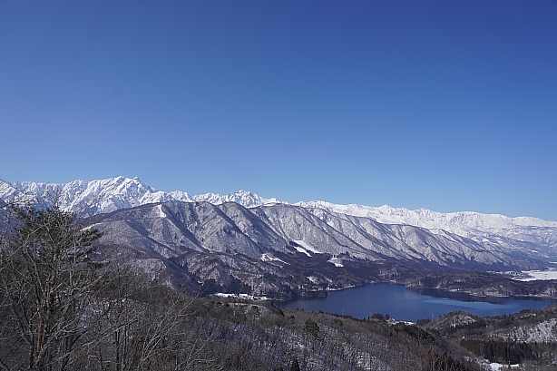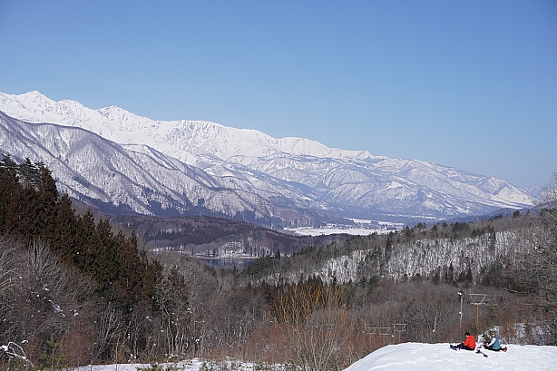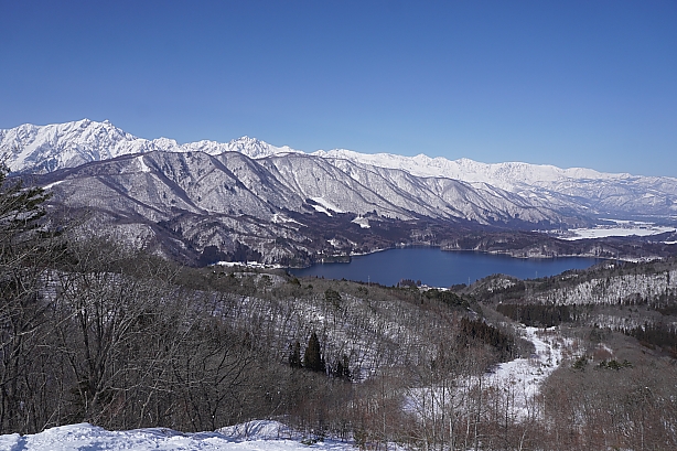 ゲレンデトップまで振り向けば…眼下に青木湖、そして爺ヶ岳、鹿島槍ヶ岳、五竜岳、白馬三山と青空に映える白銀