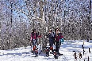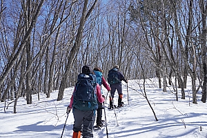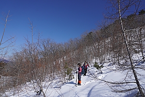 ▲ゲレンデTOPから先、権現山(1223m)は樹林の中。本日のお客様、ご参加誠に有難うございます。