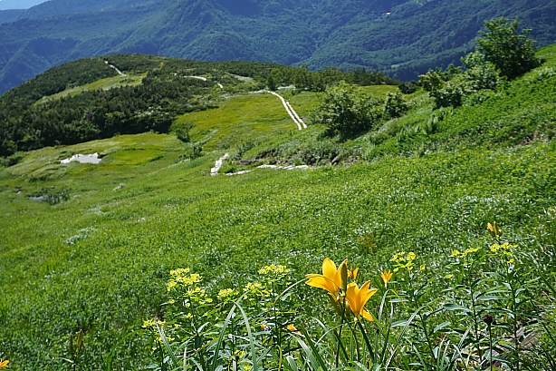 ▲花の五輪尾根の下りです(ハクサンイチゲ、シナノキンバイ)
