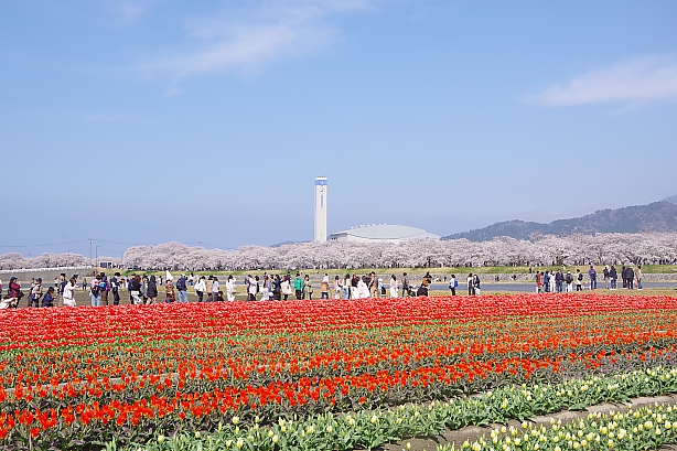 今年の菜の花は生育が良くなく、チューリップ・桜・白銀の朝日岳の三重奏ですが、充分感動の景色です。