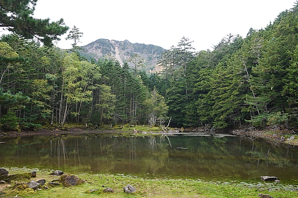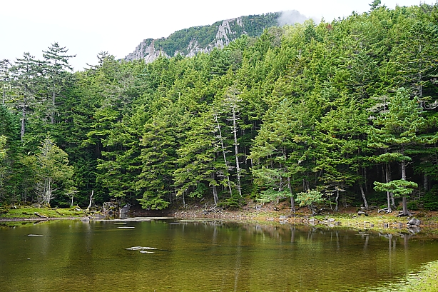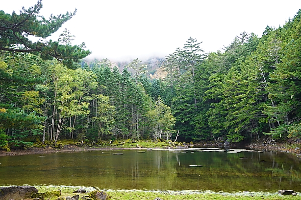 ▲小屋前の、みどり池。天狗岳は雲の中です。