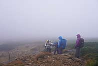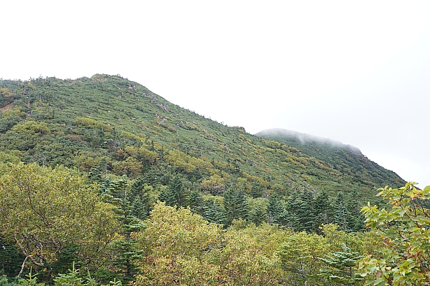 ▲本沢温泉から1時間程、夏沢峠です。硫黄岳がど〜んと見えるのですが、残念ながら深いガスの中。