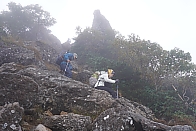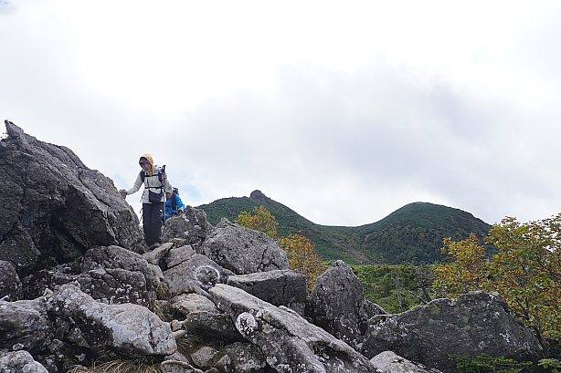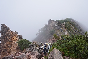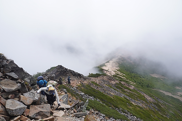 ▲天狗岳の登りに差し掛かって、やっとガスが切れてきました。