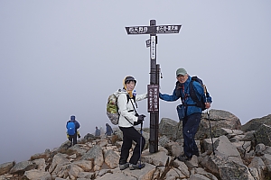 ▲箕冠山〜根石岳間は年中、強風地帯。今日も突風までは無いのですが…ガスと強風に耐え、根石岳(2603m)
