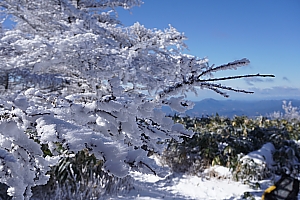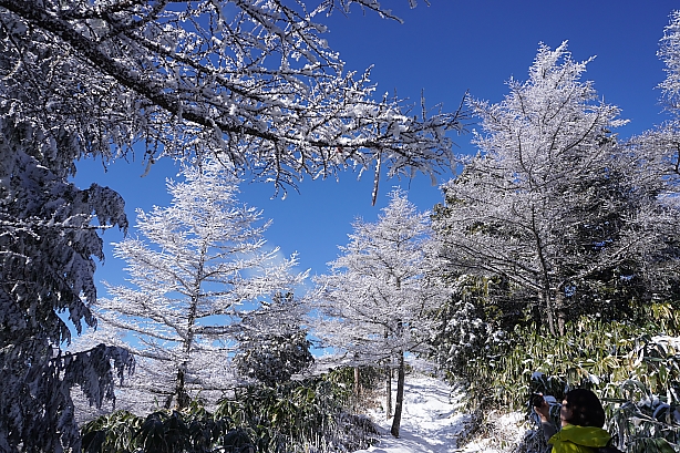 ▲頂上直ぐ手前ではこの景色のお出迎え♪ 青空に霧氷、最高です。