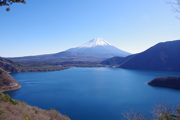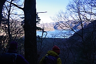 ▲端足峠から樹間に本栖湖を眺めながら湖畔に降ります。