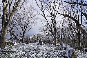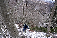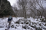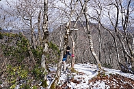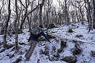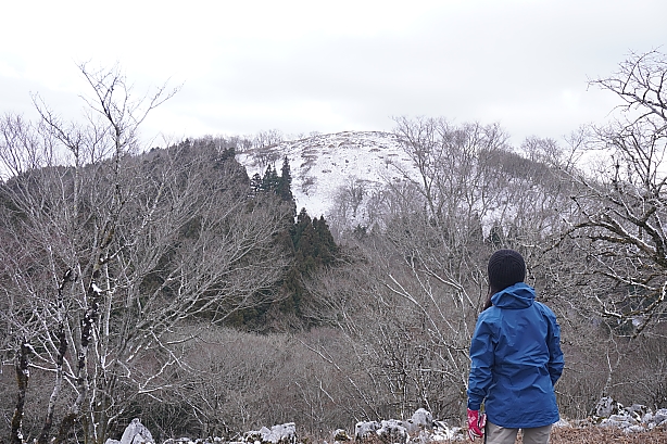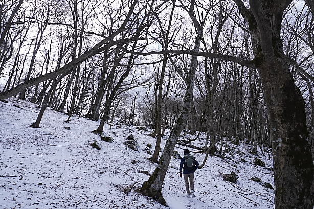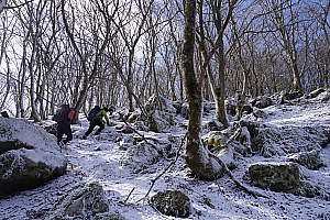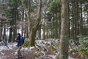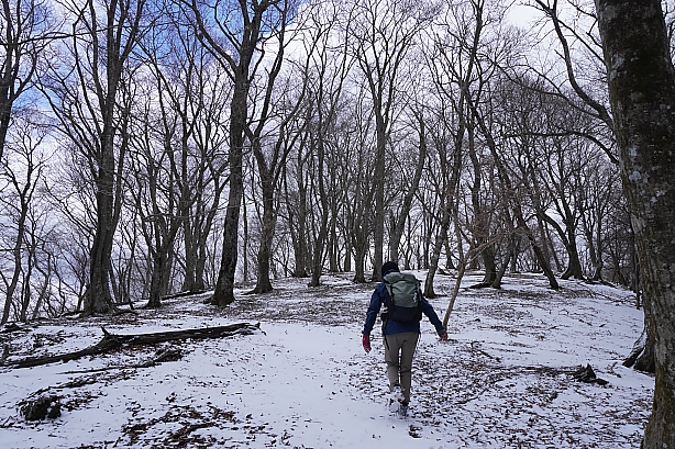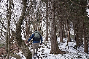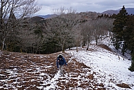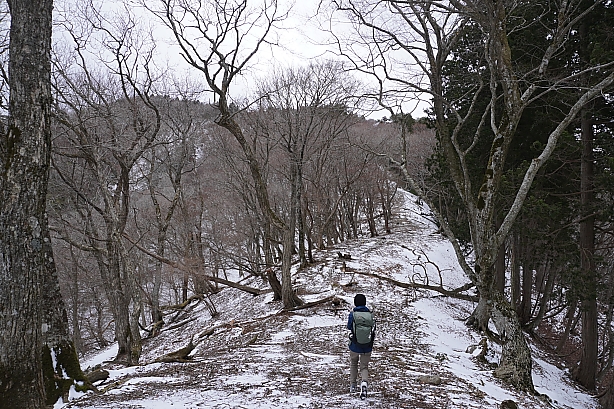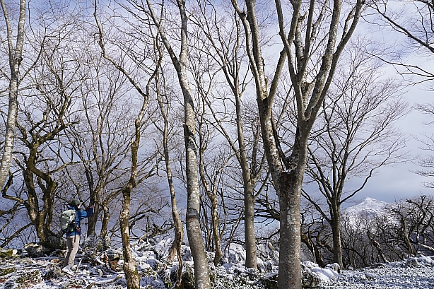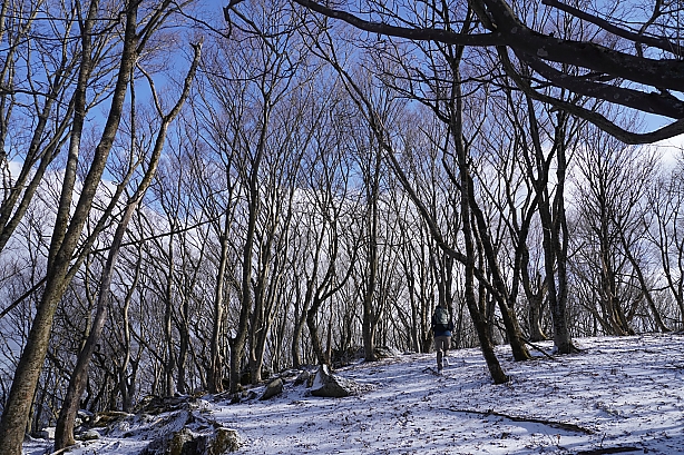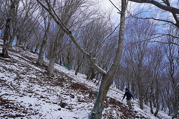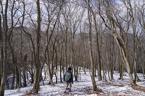 鍋尻山への登り、普段は超滑りやすく苦労するのですが、気温下降&うっすらの積雪で比較的滑らず。