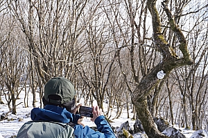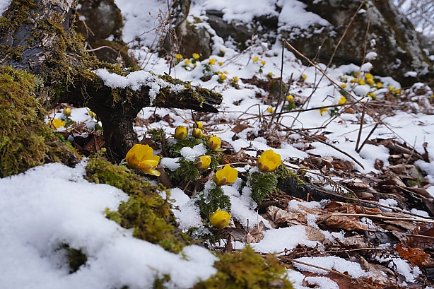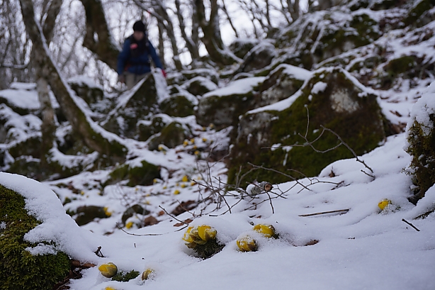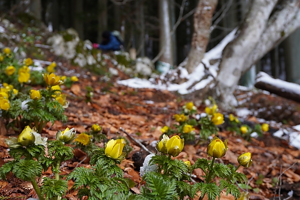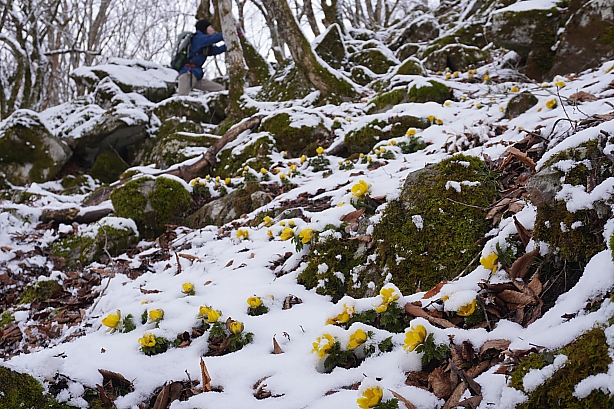 ▲▼頂上から少し先、雪の中から顔を出した福寿草群生地で撮影会♪