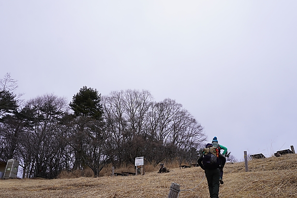 ▲先程の広い所に戻ってランチタイム。寒くは無いものの曇天の空、富士山はぼんやりです。