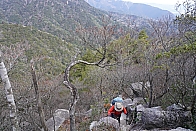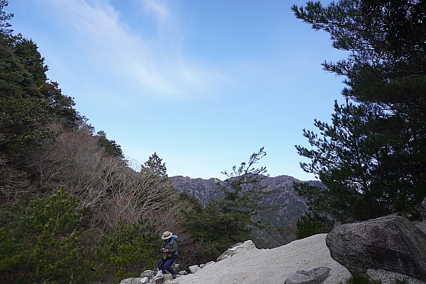 ▲三点確保の岩場あり、ヤセ尾根あり、固定ロープ設置のトラバースあり変化に跳んでます。