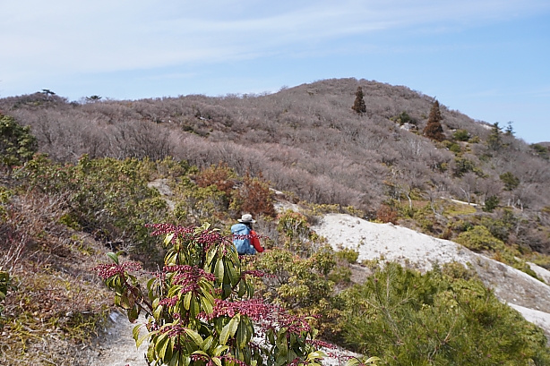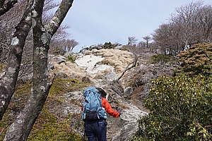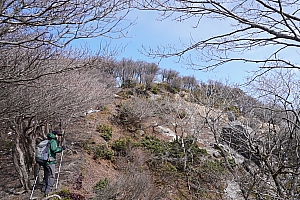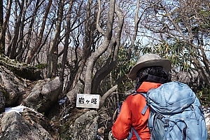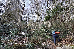 ▲シャクナゲ密生する急登斜面をひと頑張り、岩ヶ峰(926m)