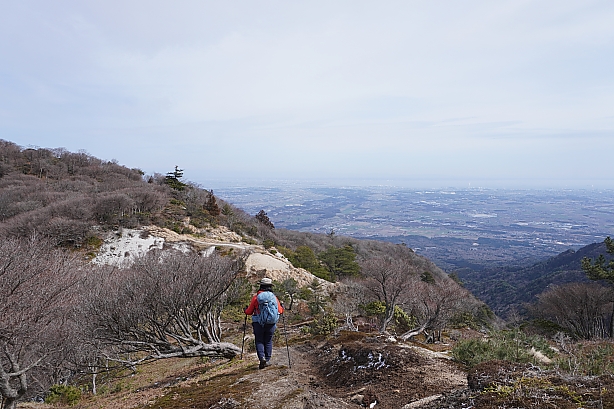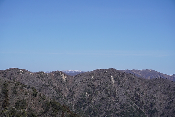 ▲後程歩く稜線。その奥の雪山は御池岳。右に竜ヶ岳