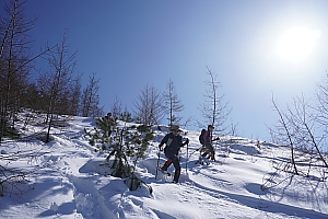 青木湖の畔、旧ヤナバスキー場、此処良いですね。スノーシュー遊びに最高!登りはじめから絶景。